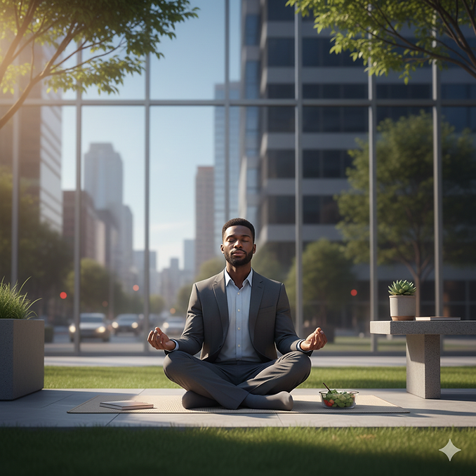 PROMPT: [An African-American professional man meditating peacefully during lunch break outside a modern corporate building, seated on a mat or chair in a quiet tree spot overlooking the city, serene posture with eyes closed, subtle elements around, contrast between calm mindfulness and busy corporate environment]STYLE: [Hyper-realistic photorealistic style, cinematic lighting, detailed textures, clean modern aesthetic]PERSPECTIVE: [Medium shot with slight angle, focusing on the person meditating while showing the corporate setting and window view for context]EMOTION: [Calm, balance, inner peace, and intentional self-care in a demanding environment]COLORS: [Soft neutral office tones, warm skin tones, gentle natural light, subtle greenery or décor accents]LIGHTING: [Soft natural daylight streaming through windows, creating a peaceful, uplifting, and mindful atmosphere]ASPECT RATIO: [1:1]
